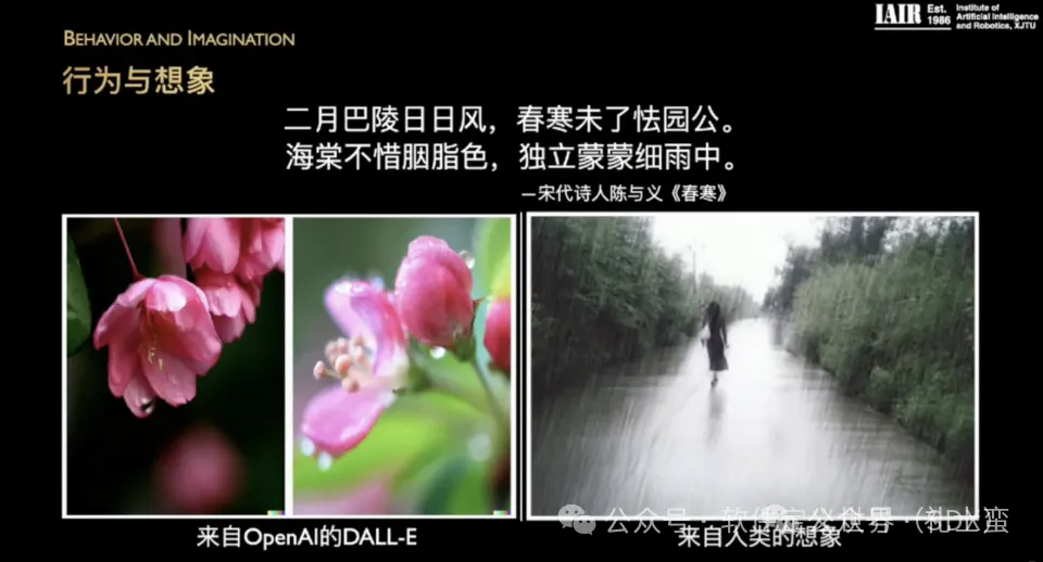 另外一个实例,给出一段西安绝句“海棠不惜胭脂色、独立蒙蒙细雨中”。让计算机语言理解的程序和人,分别从一个图像数据库中找出最贴切这段诗的图像。计算机找出了这样一幅图,海棠上挂满着雨滴,正真是“海棠不惜胭脂色、独立蒙蒙细雨中”。而人却给出右边这幅图,一位亭亭玉立的少女在蒙蒙的细雨中没有打伞,行走在幽静的小道上。被测试的人在内心把这位少女比作海棠,在这样的雨天这位少女全然不顾风雨的存在。人类理解诗歌往往是在内心深处将想象力带入现实,通过自身的认知去欣赏。
