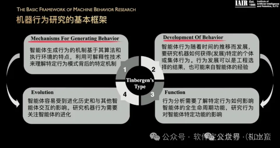 4、行为的进化,智能体容易受到进化历史和与其他智能体交互的影响,从这个角度来看,研究机器行为需要关注智能体的进化。