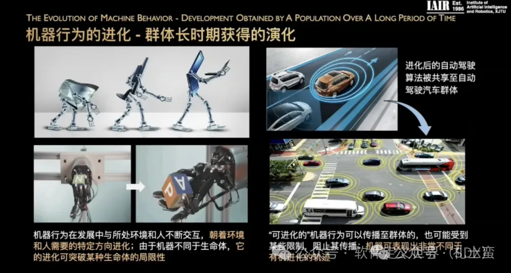 同时由于机器不同于生命体,它的进化可以突破某种生命体的局限性,而且可进化的机器行为可以传播至群体广泛的机器行为存在,也可能受到某些限制,阻止其传播,机器可表现出非常不同于有机进化的轨迹。比如进化后的无人驾驶算法,可以共享至无人驾驶汽车群体,实现行为能力的传播。