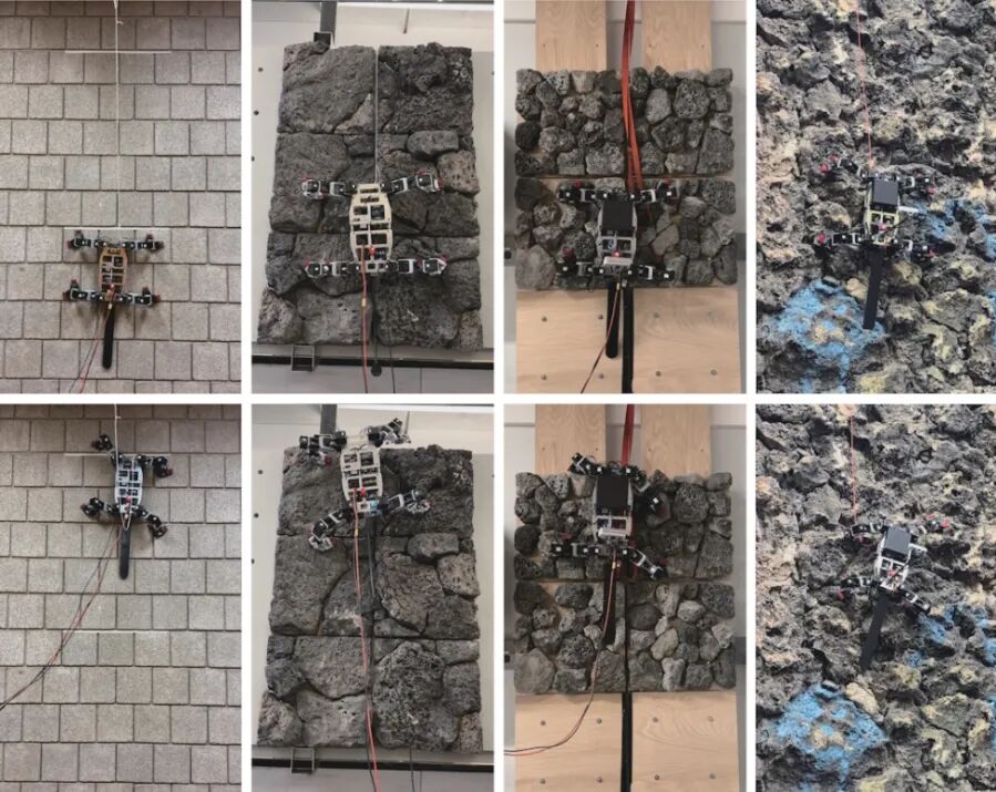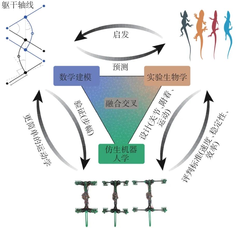 借鉴蜥蜴、蜗牛以及昆虫等自然界生物卓越的爬行和攀爬技能,以提升承担复杂危险环境探查与救援任务的轻量级仿生机器人的稳定性和节能效率[1]。当前进展主要集中在设计速度更快、效率更高的腿式机器人,使描述运动的三个关键性能标准“速度-效率-稳定性”之间的进化权衡程度成为可能。5月,美国卡耐基梅隆大学机器人研究所发布四足仿生攀岩机器人LORIS,相关成果发表在机器人学顶级国际会议ICRA 2024[2]。该成果采用了受昆虫启发的被动抓取器技术,能够在地球重力环境下垂直攀爬粗糙的岩石表面以及平直的煤渣砖墙(如图1所示)。LORIS的设计创新体现在其完全被动的抓取器和腕关节,这一设计不仅降低了机器人的整体重量和复杂度,而且通过优化控制策略显著降低了意外脱落的风险。仿生机器人采用了定向向内抓取策略,并结合板载深度感应和微处理器技术,有策略地移动腿部以实现同时对攀爬表面的抓取。尽管LORIS在多种表面的攀爬测试中展现了其能力,但其当前的可靠性尚不足以满足实际应用的需求。未来的研究需要解决在不均匀地形上的脚部选择问题,并设计出能够适应不同攀爬表面的抓取器。预计LORIS机器人在未来的行星探索任务中将发挥重要作用。7月,德国科布伦茨大学联合团队研制了一种仿生蜥蜴机器人,为人类和其他动物不同运动的进化提供新的见解,相关成果发表在《自然·机器人(Nature npj Robotics)》期刊[3]。已有研究表明,最佳运动模式需要依赖脊椎和四肢的运动,这与蜥蜴的运动模式非常一致,因此蜥蜴通常被称为“运动大师”。该成果通过模拟蜥蜴的奔跑和攀爬行为,深入探讨了不同运动模式的进化优势(如图2所示)。研究结果表明,在快速移动过程中,蜥蜴腿部的作用至关重要,适当地利用脊柱运动可以有效节约能量,然而过度依赖脊柱运动可能会影响攀爬时的稳定性。此项研究不仅为解析动物运动的进化机制提供了新视角,同时也为设计高效、稳定的有腿机器人提供了重要理论依据,预期在未来的搜索与救援任务中具有潜在的应用价值。