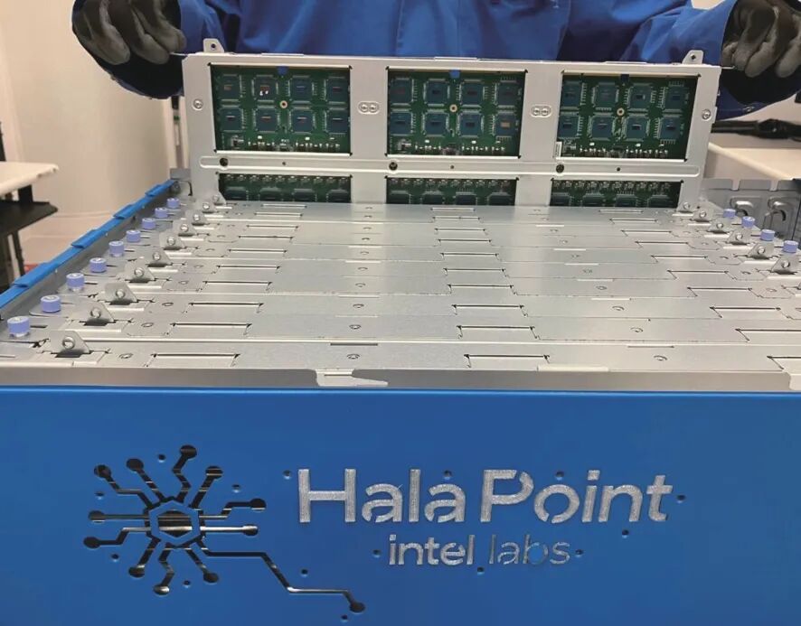 模仿了生物神经元之间完全基于脉冲的高效通信模式,神经拟态计算领域依然延续较高研发热度[9],在算法到元器件芯片到平台等各环节取得突破性进展,在精确、时敏任务中应用前景广阔。5月,比利时列日大学开发了一种新型的神经拟态脉冲神经元,旨在提升神经拟态人工智能的性能。该成果通过创新改造传统人工神经元,创造性设计实现一种名为“脉冲循环细胞”的新型脉冲神经元,该神经元能够更自然、更动态地模拟神经元的脉冲活动[10]。此外,脉冲循环细胞神经元能够将人工神经网络的复杂算法与脉冲神经网络的能源效率相结合,为开发新一代脉冲拟态网络提供了可能。脉冲神经网络旨在弥合神经科学和机器学习之间的差距,使用最拟合生物神经元机制的模型来进行计算,因此被称为第三代神经网络。这项研究的应用前景包括自动驾驶等领域,标志着在神经形态计算领域的重要进展。9月,印度科学研究所联合团队发布一种迄今为止最精确、功能最全面的14位(万亿级)神经拟态加速器设备,该设备创下了4.1万亿次运算/秒/瓦的能效新纪录,相关成果发表于《自然(Nature)》期刊[11]。该研究灵感来自于人脑,通过利用分子的自然摆动和抖动来处理和存储信息。这一神经形态加速器平台采用了分子忆阻器模拟技术,能够模拟人脑处理和存储信息的方式,从而高效地处理神经网络训练、自然语言处理等高级计算任务,并能追踪和控制分子运动。该平台采用了基于节能环保材料的高性能神经形态设备,显著提高了人工智能驱动的计算性能。这一突破性的研究成果预示着,新型神经形态计算设备有望替代现有的计算设备,为人工智能领域带来革命性的变革。4月,美国英特尔公司发布世界上最大的神经拟态系统Hala Point[12](如图6所示),并初始部署在桑迪亚国家实验室。该系统采用英特尔Loihi 2神经拟态处理器作为核心,旨在支持未来类脑仿生的人工智能研究,并解决当今人工智能效率和可持续性的挑战。Hala Point系统是在英特尔的第一代大规模研究系统Pohoiki Springs的基础上进行优化和升级的。新系统的架构得到了显著改进,能够支持分布在140544个神经拟态处理核心上的115亿个神经元和1280亿个突触,实现了神经元容量的超过10倍增长,以及性能的12倍提升。与使用中央处理器和图形处理器的传统计算机相比,Hala Point系统在执行人工智能推理和处理优化问题时速度可提高50倍,能耗仅为传统计算机的百分之一。