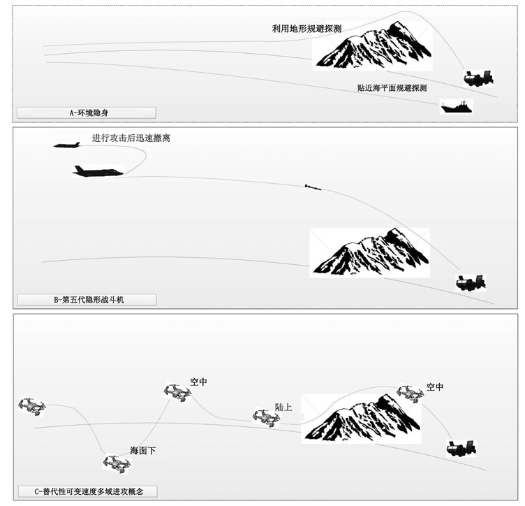 文章以多域威胁作战环境为背景提出了一种隐身概念应用更为有效的路径,进而认为下一代隐身军事理论将是人工智能、蜂群战术以及武器平台小型化的有机融合。这些技术的发展融合将推动隐身概念从传统的单一平台隐身向多域、分布式、智能化的方向转变,促使无人作战平台或无人机形成“防区内可变速多域”(stand-in variable speed multiple-domain ,SiVSMD)概念。具体而言,文章强调未来隐形军事理论发展的核心将不再依赖于速度突袭,而是通过人工智能、蜂群战术和自主系统实现的“迷惑性突袭”。