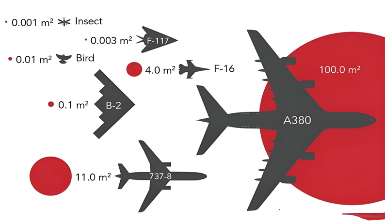 美军最新一期联合部队季刊杂志刊登了其战略顾问Theodoros G. Kostis的文章The Future of Stealth Military Doctrine(《隐身军事理论的未来》),文章认为一段时间以来,隐身军事理论的核心在于利用反探测技术,使己方能够在敌对环境中开展隐蔽行动,从而具备高概率的突袭能力。这一理论不仅涉及隐身主体的自身的电磁辐射和外观结构,还必须综合考虑其声学、视觉和红外辐射等多方面特征。在现代军事领域,空中隐身技术尤其受到关注,因为战斗机和导弹等空中武器是实施对陆、对海打击的重要手段。第五代隐身战斗机的设计,如F-117、F-22、F-35和B-2等隐身飞机,以及隐身驱逐舰如朱姆沃尔特级驱逐舰,都以减少雷达截面为主要目标,从而降低被敌方传感器探测到的概率。如图1所示,可见隐身飞机的雷达截面积远小于客机,体现了隐身飞机通过降低雷达截面积、提升隐身性能的特点。