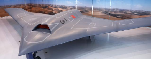 彩虹-7无人机是中国航天科技集团研制的高空隐身战略级无人侦察机,采用翼身高度融合的飞翼布局和锯齿状水平尾翼,采用2台总推力为10吨的涡扇发动机,翼展27.3米,最大起飞重量为8吨,实用升限约为16000米,巡航速度为610km/h,航时为16小时,航程可达1万公里,可在高对抗环境中执行持续隐蔽侦察和情报获取任务,为远距离打击武器提供目标指引,其核心对标对象是美国RQ-180“白蝙蝠”无人机和B-21轰炸机。