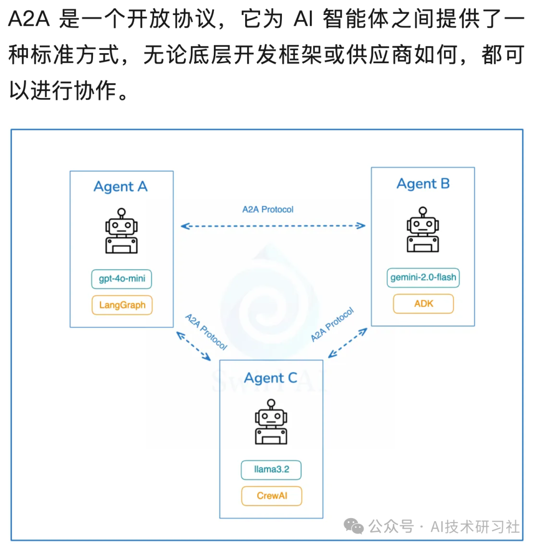 在多Agent系统中,不同智能体可能基于不同框架开发(如LangGraph、CrewAI、AutoGen等),彼此之间无法互通任务和状态。