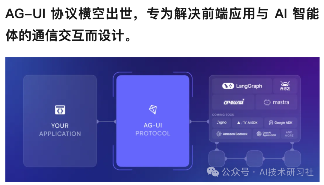 避免每次都从零开发UI组件,是构建AI对话助手、客服系统的高效方案。AG-UI 让AI智能体在网页、APP、嵌入式设备中“自然生长”。