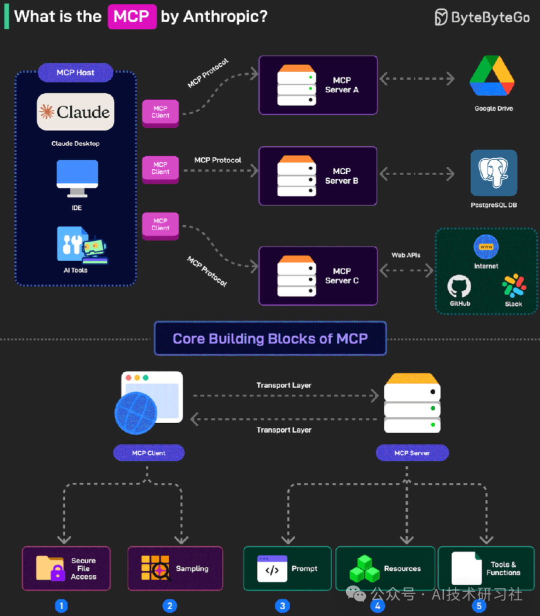 MCP由Anthropic提出,统一了不同模型与外部工具、数据源之间的通信标准。