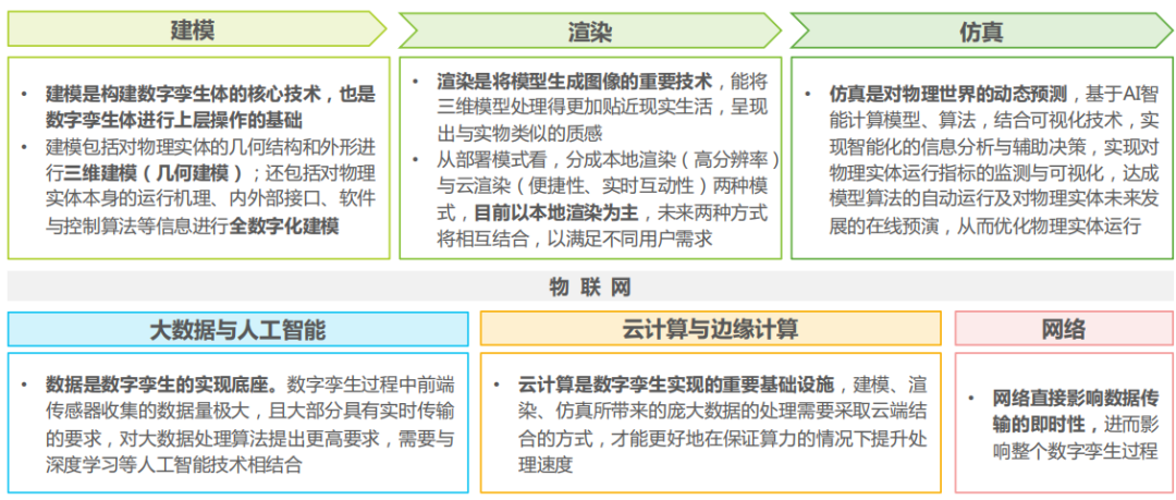 建模、渲染、仿真和物联网技术的融合构成了数字孪生的核心技术框架。分别负责构建模型,让模型更贴近现实,让模型适用现实世界物理法则。除此, 数字孪生体需要和物理实体保持全生命周期状态的同步更新,要求数据实时同步,因此大数据、云计算以及网络成为必不可少的底层技术支持,保证数据流通、实时交互。