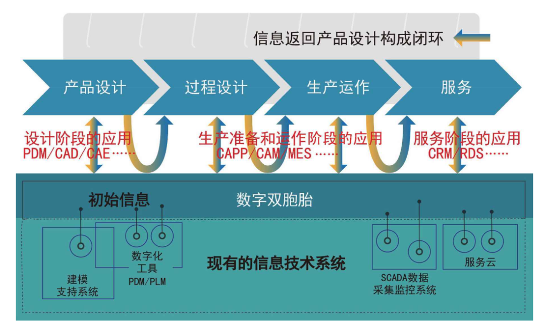 “工业4.0”术语编写组对数字孪生的定义是:利用先进建模和仿真工具构建的,覆盖产品全生命周期与价值链,从基础材料、设计、工艺、制造及使用维护全部环节,集成并驱动以统一的模型为核心的产品设计、制造和保障的数字化数据流。通过分析这些概念可以发现,数字纽带为产品数字孪生体提供访问、整合和转换能力,其目标是贯通产品全生命周期和价值链,实现全面追溯、双向共享/交互信息、价值链协同。