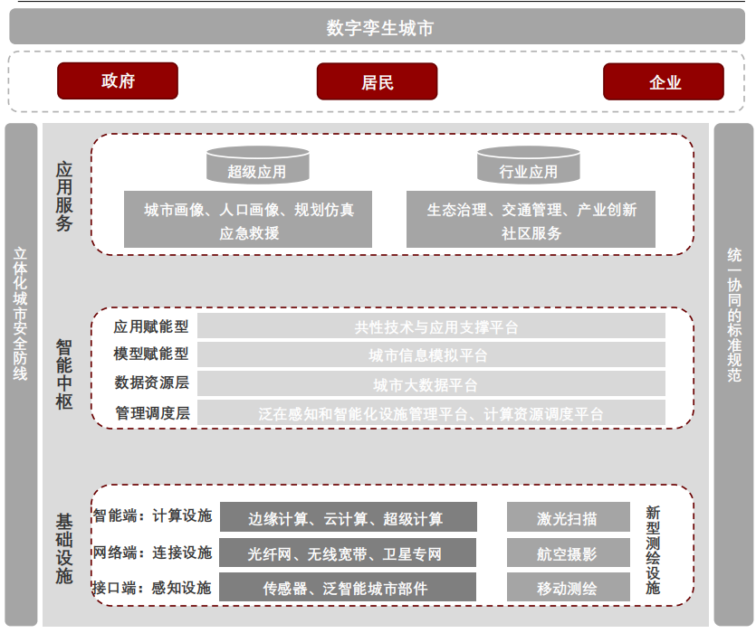 《中国十四五远景规划》中明确提出探索数字孪生城市与城市数据大脑的建设,并且将加快数字化中国的建设。构建数字孪生城市,实现对现实世界的监测、诊断、 回溯、预测和决策控制,用于实体城市的规划、建设、 治理和优化等全生命周期管理,应用于交通管理、零碳智慧园区和应急管理等领域,提高城市运行效率。