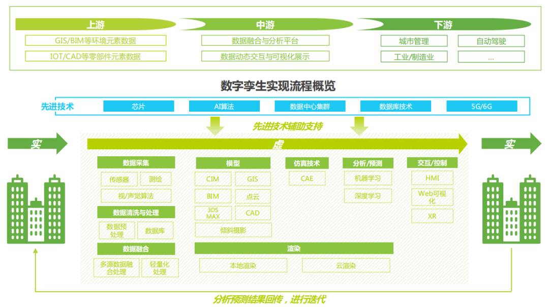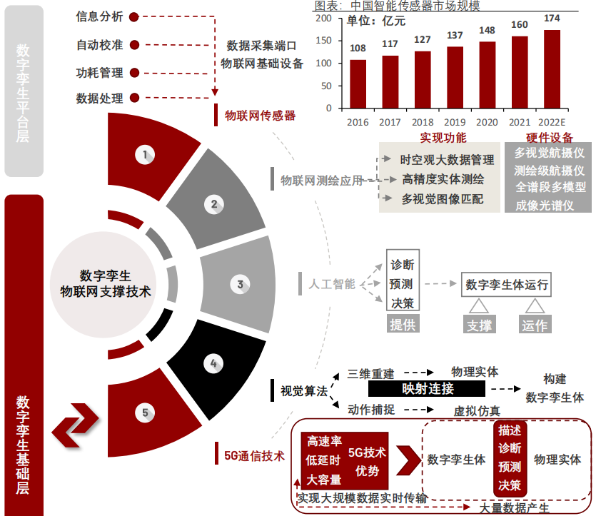 数字孪生的本质是技术集成,实现数字孪生需要依赖诸多基础数字技术的融合创新,包括物联网传感器、物联网测绘应用、人工智能、视觉算法与5G通信技术的融合创新。