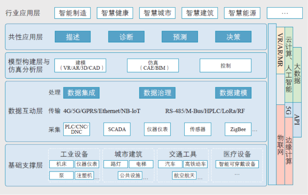 数字孪生基础层技术构成可分为四大体系,分别包括感知与标识技术、网络和通信技术、计算与服务技术及管理与支撑技术。