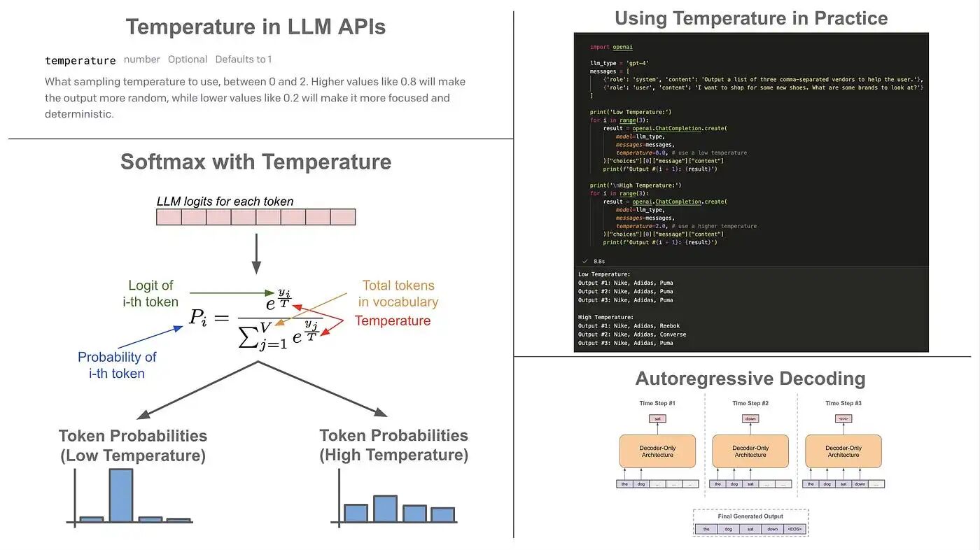 你看,这个大模型不只是知道标准答案,它还理解了语言的细微差别:什么时候用缩写,什么时候用正式表达,甚至知道"饿"的不同程度。这些概率分布包含了模型对语言的深层理解。(2)温度参数(Temperature),控制模型"谦虚"程度的开关如何让模型把这些宝贵的"内心想法"表达出来?这就是温度参数发挥作用的地方。在实际操作中,我们用一个叫"温度"(Temperature)的参数来控制模型输出概率分布的"平滑程度"。
