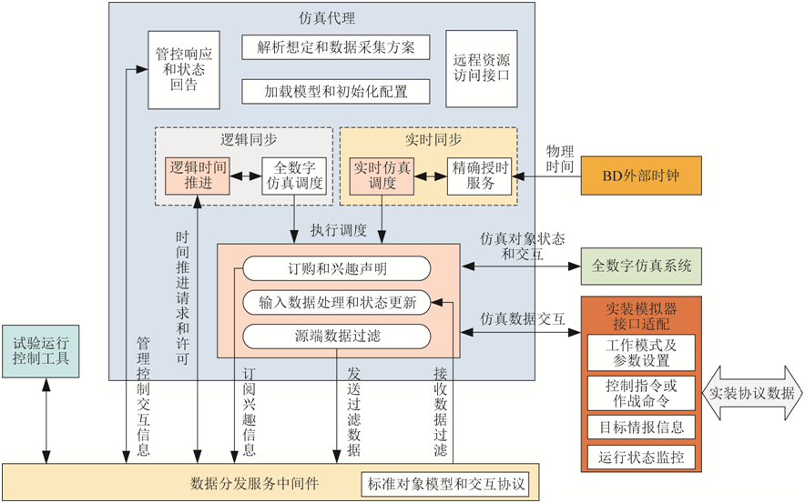 针对数字平行战场敏捷集成、随遇接入、时空一致等需求,以面向数据的分布式仿真通信中间件为基础,采用“总控+代理”的层次化仿真体系结构,构建一套物理上分布、逻辑上统一的联合仿真支撑环境,有助于解决当前仿真底座建设时常见的仿真与评估相关工具离散、异构仿真资源集成能力不强等问题;通过数字、模拟器、实装等不同类型仿真系统的综合集成,为联合仿真试验的灵活应用提供便利,并提升仿真置信度。