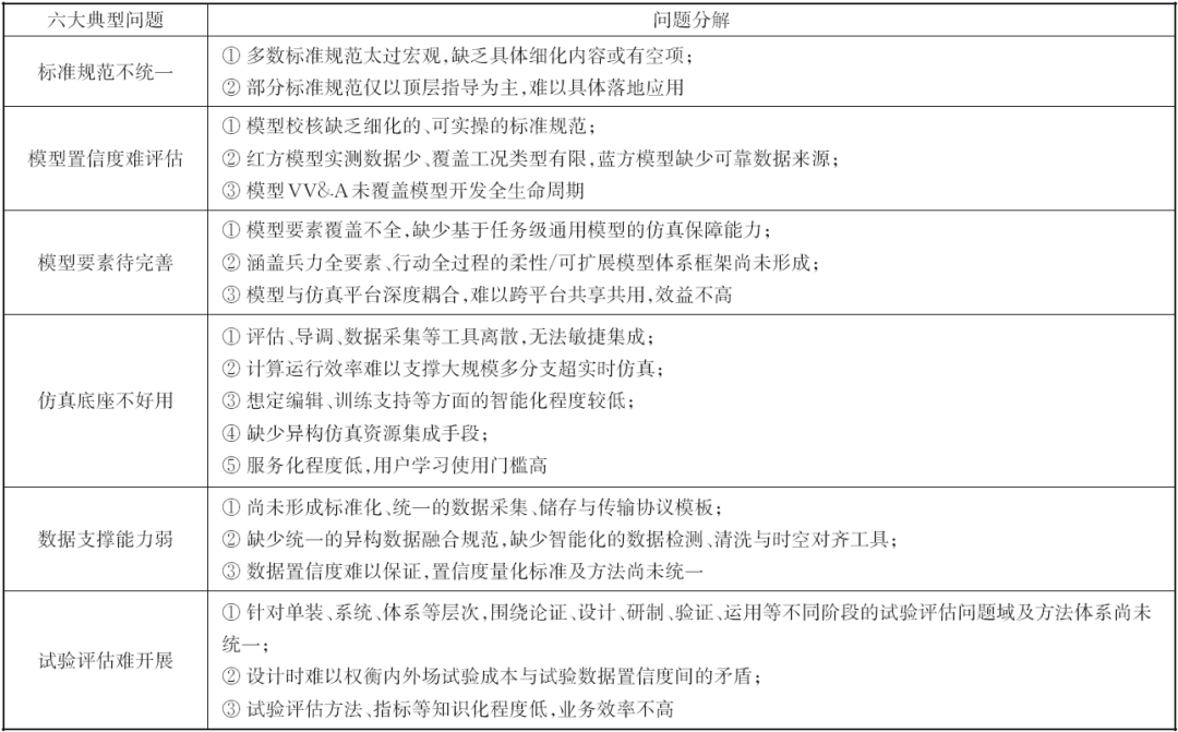 对照数字平行战场建设需求和现有能力,本文梳理得到六大典型问题,如图2所示。这些问题从根源上导致数字平行战场“建设散、共享难、成本高”,难以支撑应用实践。为指导后续数字平行战场建设的探索,本文对上述典型问题作进一步分解,探寻其背后的根源因素,如表2所示。