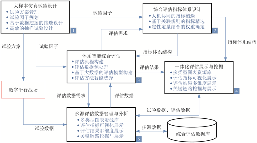 (3)体系智能综合评估:主要针对未来战争作战体系结构复杂、体系间耦合严重的问题,提供柔性可重构的评估流程、数据驱动的评估模型和智能化的评估方法选择等功能。