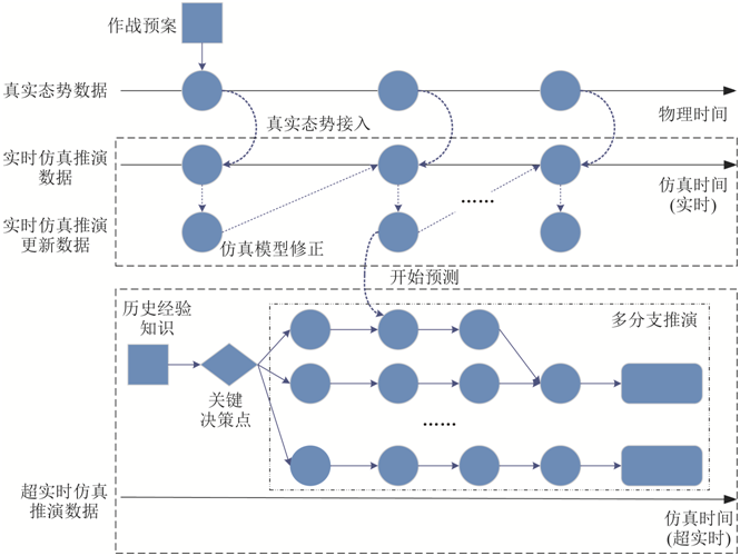 针对数字平行战场仿真推演过程中存在的态势预测困难、计算资源有限以及多方案并行推演效率要求高等难点,可根据历史情报数据估计蓝方作战意图,计算各决策分支的概率,确定影响作战态势的关键决策点,进而基于关键决策点采用仿真克隆技术对预测的多分支进行并行推演,同时基于实时战场情报数据不断修正推演进程、提升仿真底座的运行效率及性能,并通过超实时快速推演,将态势预测及作战方案评估结果反馈给决策人员,如图4所示。具体研究内容包括以下4方面。