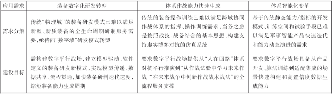 反观国内,自1994年提出平行系统构想,到2004年提出平行系统基本思想、概念、运行框架等,平行系统相继应用于我国应急管理、军事等领域,数字平行战场相关概念逐渐成熟,在任务规划、辅助决策、试验训练等领域相继提出应用框架[7-10]。从需求端看,“十四五”期间的国防现代化建设需求,尤其以人工智能为代表的新质新域技术应用需求,对加快军工数字化转型提出更高要求[11]。从供给端看,工业部门已在数字平行技术与仿真有机融合方面取得建设成果,亟待开展落地应用尝试,如中国航天科工集团有限公司基于数字平行技术构建的智能作战指挥系统、中国电子科技集团有限公司开发的数字孪生战场系统。