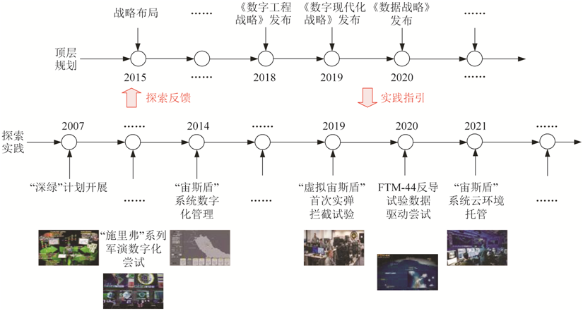 为利用数字技术加快作战能力生成,抢占数字变革的主动权,美国国防部从2015年起开始实施数字工程(Digital Engineering)战略,陆续发布多份顶层文件,以指导美国海军、陆军等军种的数字化转型[5-6]。当前,美军已处在数字化转型战略的增速阶段,其相关理论技术已迈过理论争辩门槛、进入备战落地阶段,在“施里弗”系列军演、“虚拟宙斯盾”系统、“深绿”计划、FTM-44反导试验等军事活动中进行实践探索,有效指导了美国军队建设和武器装备发展,如图1所示。
