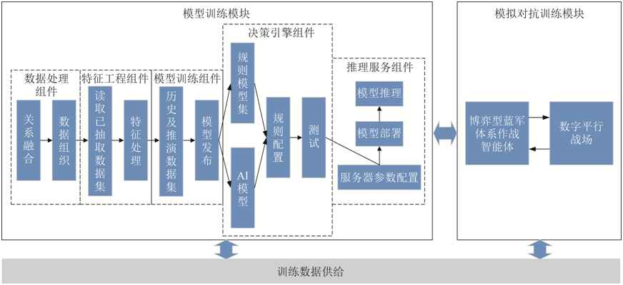 数字蓝军在数字平行战场中主要用于模拟敌方作战能力、装备特性及战术战法,其直接影响仿真推演逼真度和对抗性。目前,美军已通过基于数字孪生的红蓝军建设显著提升其仿真对抗环境对作战人员应变能力和作战技能的辅助效能[22];反观国内,相关蓝军建设及应用尚存在对抗性不强、训练样式简单等问题。近年来,围绕进一步提升蓝军的博弈对抗支撑能力,部分学者提出基于机器学习等智能算法进行参数生成及训练的研究方法,以解决蓝军模型的对抗性、逼真度等问题[23-26]。