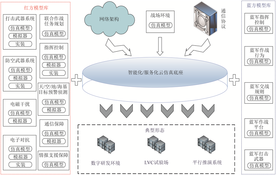 通过在智能化/服务化云仿真底座中集成实装(L)、仿真模拟器(V)、全数字仿真系统(C)等体系全要素资源,构成高逼真度、虚实结合、支持博弈对抗的全要素LVC试验场,支撑装备试验鉴定和典型作战科目验证等。
