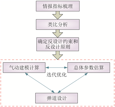 针对贫信息下蓝方体系中的主战装备、典型作战行为,通过期刊、会议资料、手册等途径搜集相关装备和行为的情报指标,采用类比分析法梳理得到反设计原则及约束条件。在此基础上,通过类比法结合已知参数对未知参数进行合理估算,删除不合理参数,并基于合理的算法反复迭代计算,从而优化设计出高置信度的蓝方装备和行为要素模型,以支撑蓝方体系模拟构建及应用评估。图5所示为以蓝方导弹装备为例的反设计流程。
