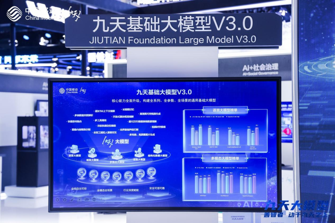 中国移动在大会上发布“九天”基础大模型3.0,此次迭代,“九天”的“众擎”语言大模型实现架构与性能双重跃迁,驱动复杂推理能力提升35%,在ArenaHard V1.0中,夺得94.1的高分,位居业界前列,进一步强化可控生成能力,破解沉浸式角色演绎,实现了专业场景零幻觉;“九天”的“善智”多模态大模型全面提升生成可控性与理解能力,基于复杂时空建模、流匹配图片视频渐进式联合训练、端到端局部可控注意力机制等创新,同时引入多模态理解信息提升对文本指令和输入条件图像视频的感知能力,联合图文交织数据训练,实现既能生成高质量的图像视频,又能进行多轮对话式高可控精确编辑操作。