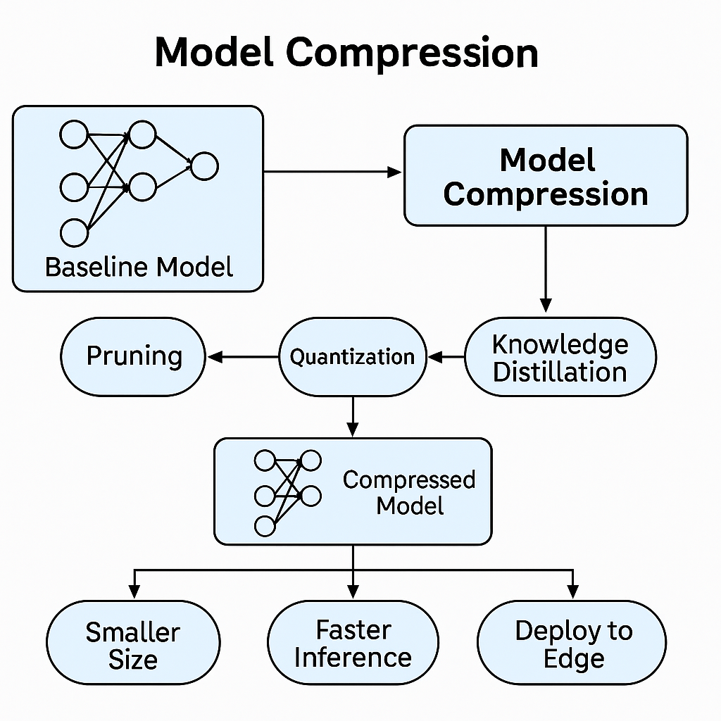 模型压缩技术正是为了解决这些问题而生,通过系统性的优化手段,将庞大的基线模型转换为轻量化的压缩模型(Compressed Model),最终实现三大关键目标:更小的模型尺寸(Smaller Size)、更快的推理速度(Faster Inference)、边缘设备部署能力(Deploy to Edge)。