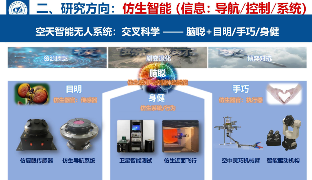 目前,类脑智能、具身智能等方向已经成为人工智能领域的热点。类脑智能以计算智能为工具,在模拟人类感知、思维和学习能力的基础上,使得无人系统初步具备视觉、听觉、触觉等功能及结构化场景下行动能力。具身智能则进一步强调机器通过感知交互与环境进行实时互动的能力,逐步形成了以共融机器人、人形机器人、类生命机器人为代表的研究方向。但是,这些研究成果大多局限于“固定环境、预设情境、协作模式”,无法适应“极端环境、机动任务、对抗模式”,不能满足空天无人系统自主化、智能化的迫切需求。