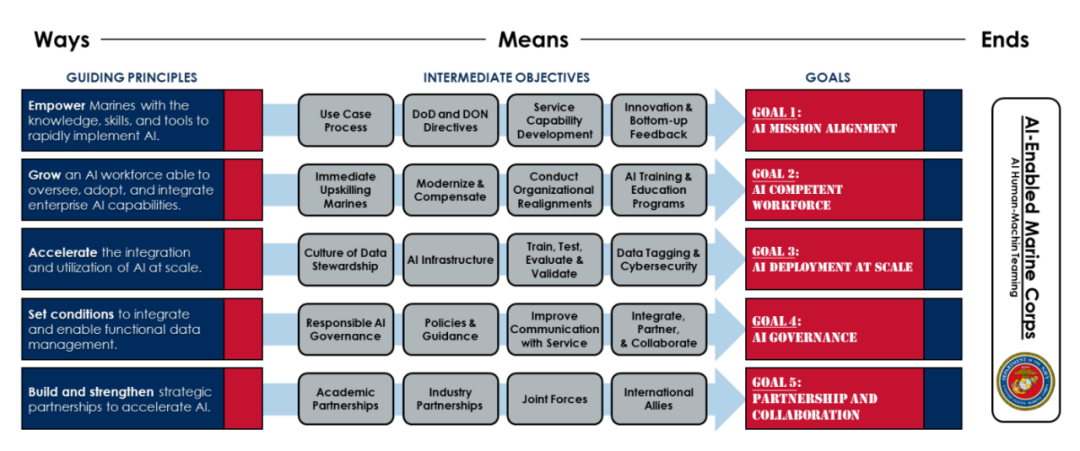 - AI在规模上的部署:确保AI在整个海军陆战队中得以大规模应用,涉及数据管理、基础设施建设等方面。