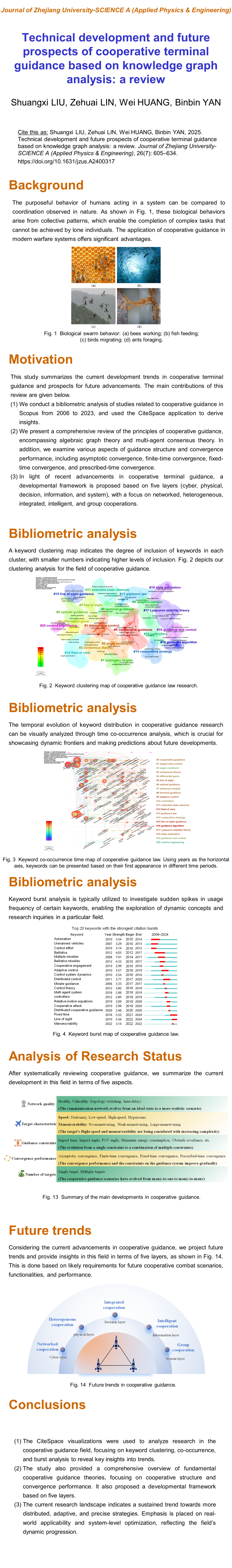 协同制导是一种通过信息共享与协同效应实现对抗目标的方法,已成为导弹制导与体系化对抗领域的重要研究方向。本研究对当前协同制导研究进行了系统性梳理与分析:首先,基于Scopus数据库与CiteSpace软件对513篇文献开展文献计量分析,通过关键词聚类、共现与突现评估研究热点并进行可视化呈现;然后,从相对运动建模、代数图论、多智能体一致性理论三个维度归纳协同制导基础理论;随后,根据协同结构与收敛性能对现有协同制导律进行归类综述;最后,从五个方面总结研究进展,提出基于五层架构(网络层、物理层、决策层、信息层、系统层)的发展框架,探讨协同末制导未来可能的发展方向。该框架重点聚焦网络化协同、异构化协同、一体化协同、智能化协同与集群化协同五个研究维度,旨在为后续研究提供发展趋势与思路参考。