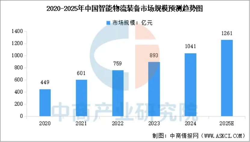 智能物流装备指用于产品运输和储存的自动化装备和系统。中商产业研究院发布的《2025-2030年中国智能物流装备行业研究报告》显示,在供应链自动化需求增长、物联网和人工智能技术进步的推动下,中国智能物流装备的市场规模从2020年的449亿元增至2024年的1041亿元,复合年增长率为23.4%。中商产业研究院分析师预测,2025年中国智能物流装备市场规模将达到1261亿元。