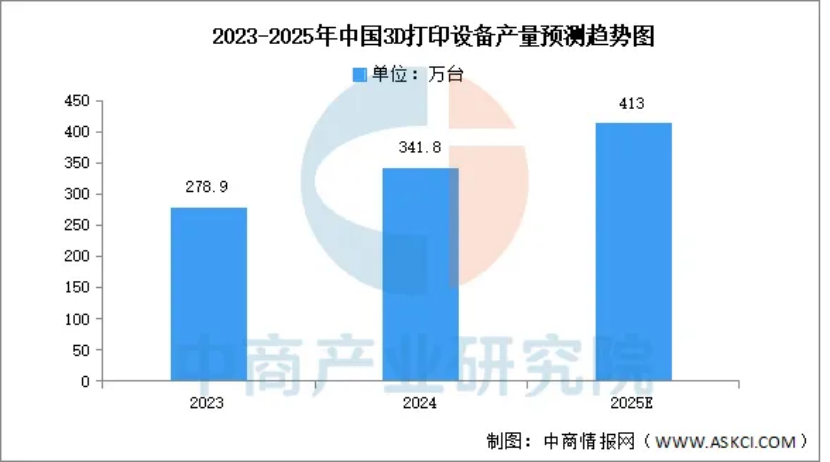 3D打印技术,有别于传统减材制造,是一种快速成型技术,通过对模型数字化立体扫描、分层处理,借助于类似打印机的数字化制造设备,利用材料不断叠加形成所需的实体模型。中商产业研究院发布的《2025-2030年中国数控机床行业调查及发展前景分析报告》显示,2024年中国3D打印设备产量341.8万台,增长11.3%。中商产业研究院分析师预测,2025年产量将超400万台。