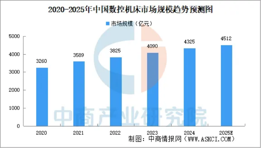 数控机床,即数字控制机床,是一种配备有程序控制系统的自动化机床。近年来,数控机床市场呈现出快速发展的态势,行业规模持续扩大,整体运行状况稳中向好。中商产业研究院发布的《2025-2030年中国数控机床行业调查及发展前景分析报告》显示,2024年中国数控机床市场规模达到约4325亿元。中商产业研究院分析师预测,2025年行业市场规模将超4500亿元。