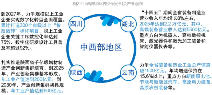 中西部地区:以四川、河南为核心, 虽落后于东部地区,但正依托当地高校及科研院所的优势资源,积极探寻智能制造装备的发展路径。其中,先进激光行业成为了该区域智能制造装备发展的“新亮点”,四川、河南等地已发展出技术领先、特色鲜明的先进激光行业,并且正紧抓国家战略机遇,加快推进智能制造装备的全面发展。