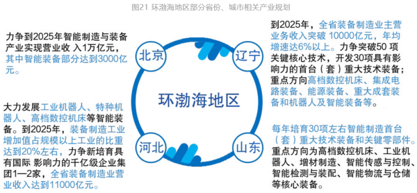 环渤海地区:以北京、山东等为核心,我国高校和科研院所高度集中的区域,人才储备雄厚,科研实力突出。该区域形成了以京津冀“核心区域”与山东半岛、辽东半岛“两翼”错位发展的产业格局。其中,北京在工业互联网及智能制造服务等软件领域优势突出,河北、山东、辽东等周边省份的智能制造装备产业规模持续扩大。