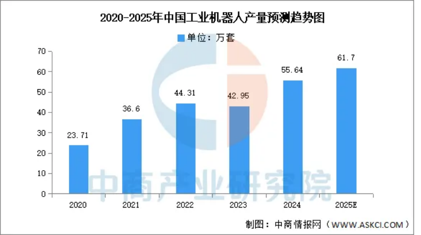 近年来,我国工业机器人产量总体呈现增长趋势。中商产业研究院发布的《2025-2030年中国工业机器人行业深度调查及投融资战略研究报告》显示,2024年全国工业机器人产量为55.64万套,同比增长14.2%。中商产业研究院分析师预测,2025年产量将超过60万套。