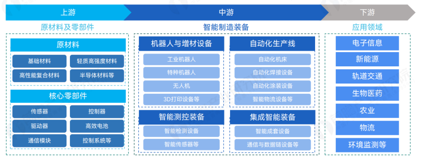 智能制造装备产业链涵盖上游的原材料与零部件,中游的制造,以及下游的应用。上游以基础材料和高性能元件为主,中游涉及环节众多,根据产业链细分情况,将中游智能制造装备划分为机器人与增材设备、自动化生产线、智能测控装备、集成智能装备等,下游应用于多领域如电子信息、新能源、轨道交通、生物医药、农业、物流、环境监测等。智能制造装备产业链通过从上游的高性能材料和元件,到中游的多样化智能制造技术,再到下游的广泛应用领域,表明智能制造装备产业是现代产业发展中的核心基础产业,并在多领域具备重要影响力。