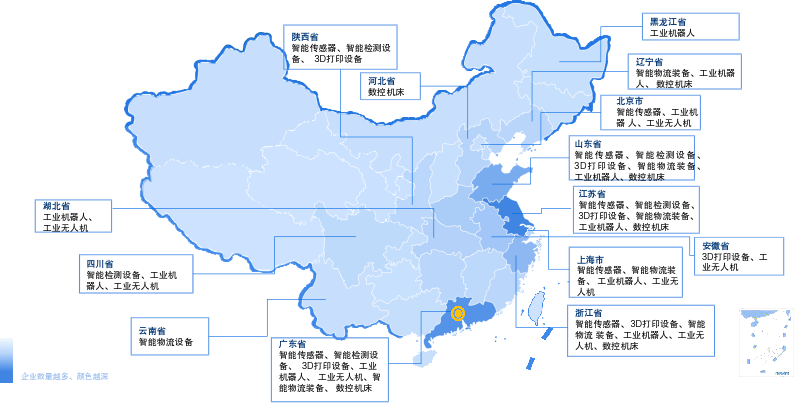 广东、江苏、浙江、上海、山东为主要分布区域,特别是广东省覆盖领域最为广泛,企业数量也处在全国前列,为中国智能制造装备产业的关键省份之一。
