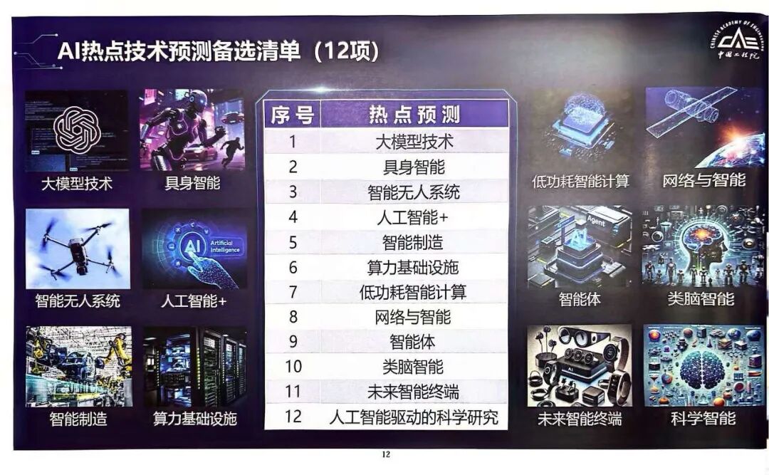 中国工程院信息与电子工程学部副主任余少华院士介绍,与百姓密切相关的12项AI热点技术,分别是大模型技术、具身智能、智能无人系统、人工智能+、智能制造、算力基础设施、低功耗智能计算、网络与智能、智能体、类脑智能、未来智能终端、人工智能驱动的科学研究。