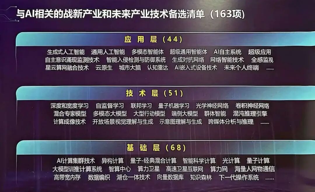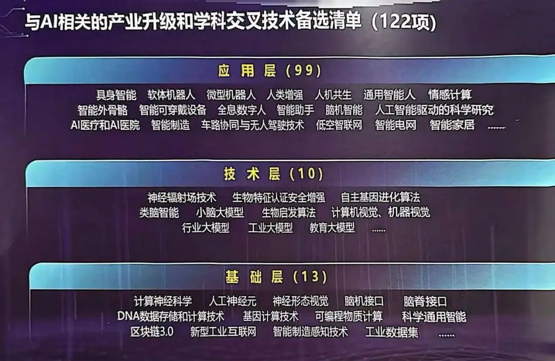 在中国工程院信息与电子工程学部主任费爱国院士发布的备选清单中,“与AI相关的战新产业和未来产业技术备选清单”共163项,“与AI相关的产业升级和学科交叉技术备选清单”共122项,“AI热点技术预测备选清单”共12项。