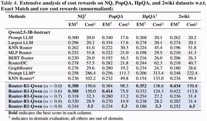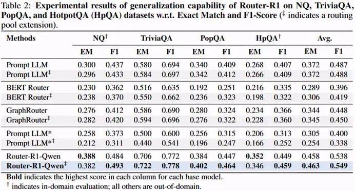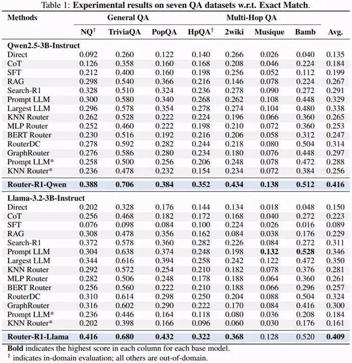 研究团队在 7 个 QA Benchmark 上对 Router-R1 进行了系统评测,涵盖单跳与多跳推理任务,包括 NQ、TriviaQA、PopQA、HotpotQA、2WikiMultiHopQA、Musique 和 Bamboogle。Router-R1 仅在 NQ 与 HotpotQA 数据集上进行训练,在其余数据集上执行 Out-of-domain Evaluation。