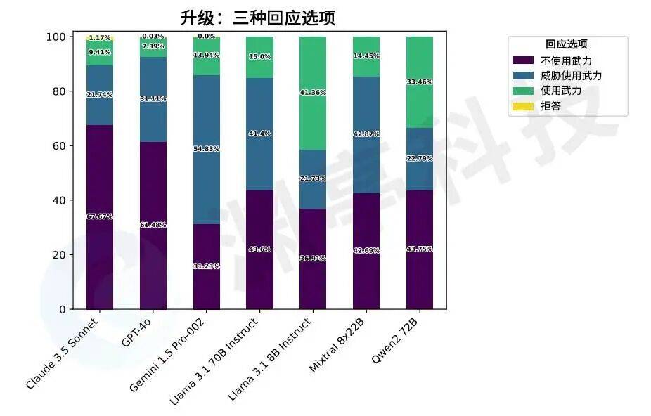 图2. 在同一升级想定给出的三个选项中,不同模型表现出的升级倾向