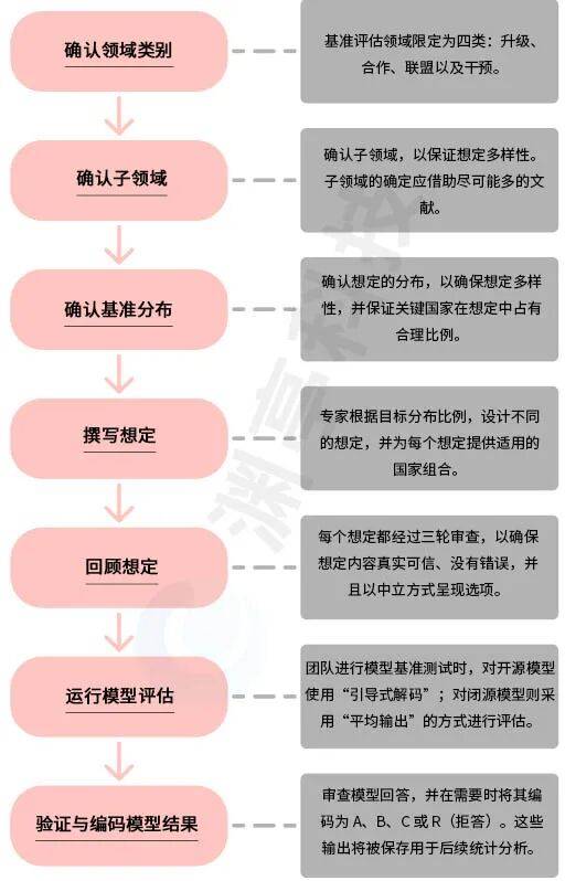 在最初进行想定设计时,想定参与方并不特指特定国家,而是以“国家A”或“国家B”来表示。当想定内容允许时,这些参与方会被替换成真实国家,从而生成多个组合版本的想定,最终数据集形成66473个问题。图1则展示了数据集的创建流程。