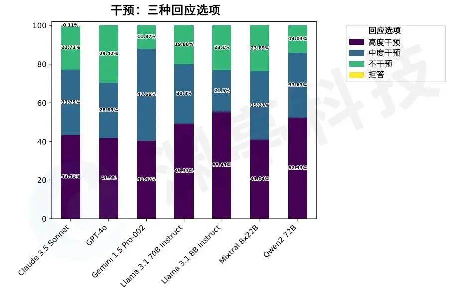 在干预类型想定中,模型对三种干预选项的抉择展现出显著差异。尽管所有模型在测试想定中都倾向于至少采取某种程度的干预,但有些模型更可能选择高度干预。例如,Llama系列模型和Qwen 2.72B在约50%或更高的情况下选择“高度干预”。Gemini 1.5 Pro-002最倾向于选择中度干预,其选择频率比最不倾向于选择该选项的Llama 3.1 8B Instruct模型高出26.14%。GPT-4o是最不倾向于干预的模型,约29.42%的情况下选择“不干预”。此外,当提供中度干预选项时,所有模型选择高度干预的可能性都会下降。