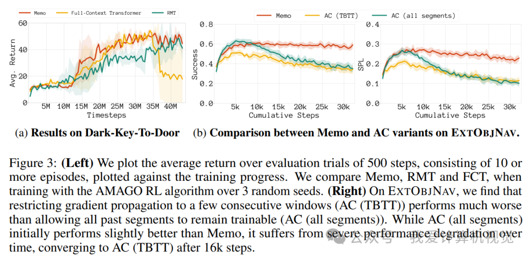 图3 (a) 展示了在Dark-Key-To-Door任务上的结果,Memo 同样表现出色。图3 (b) 则进一步比较了 Memo 和AC变体在EXTOBJNAV上的表现。