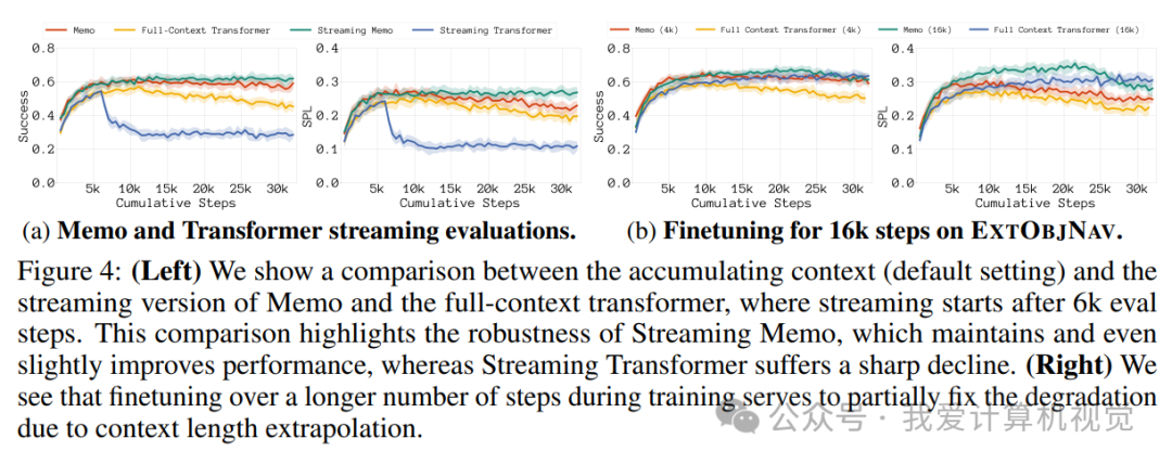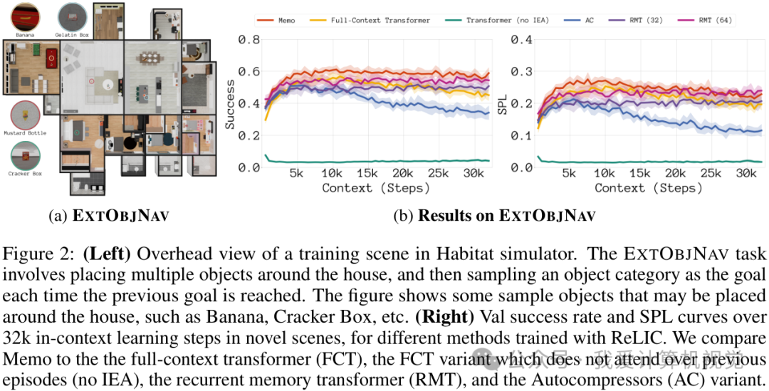 图2展示了在EXTOBJNAV任务中,不同方法在32k上下文学习步骤中的成功率和SPL曲线。我们可以清楚地看到,Memo 在性能上显著优于朴素的长上下文Transformer基线(FCT)、不关注前一回合的FCT变体(no IEA)、循环记忆Transformer(RMT)以及Autocompressors(AC)变体。这表明 Memo 不仅能够有效地处理长时序任务,而且在复杂环境中表现出更强的泛化能力。
