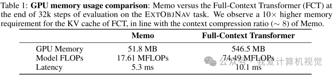 表1对比了 Memo 和全上下文Transformer(FCT)在EXTOBJNAV任务评估结束时(32k步)的GPU内存使用情况。结果显示,FCT的KV缓存内存需求是 Memo 的 10倍 之高,这与 Memo 的上下文压缩比(约8倍)相符。这意味着 Memo 能够以更少的资源实现更好的性能,这对于实际部署具身智能体具有重要意义。