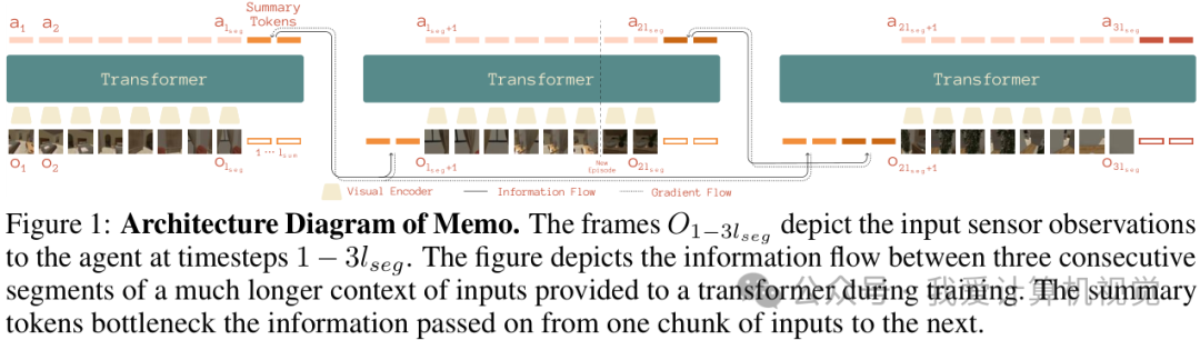 图1展示了 Memo 的架构图。我们可以看到,输入观测(O1-3lseg)被分成多个段,每个段结束后会生成一个摘要令牌,这个令牌将信息从一个输入块传递到下一个输入块,形成一个信息瓶颈,从而实现记忆的压缩。