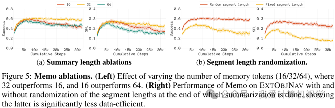 图5 (左) 探讨了不同数量记忆令牌(16/32/64)对性能的影响,结果显示32个令牌的表现优于16个,而16个又优于64个。这表明记忆令牌的数量需要仔细权衡。图5 (右) 则比较了随机和固定段长度的摘要生成方式,结果表明随机段长度在数据效率上显著更高。